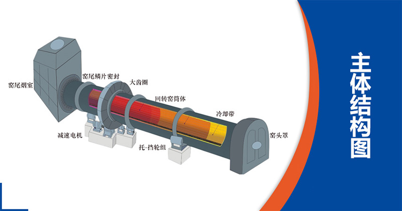 物料從窯尾(筒體的高端)進入回轉窯內煅燒。由于筒體的傾斜和緩慢的回轉作用,物料既沿圓周方向翻滾又沿軸向(從高端向低端)移動,繼續完成其工藝過程,后,生成熟料經窯頭罩進入冷卻機冷卻。燃料由窯頭噴入窯內,燃燒產生的廢氣與物料進行交換后,由窯尾導出。?